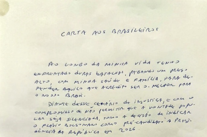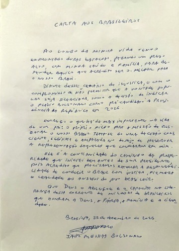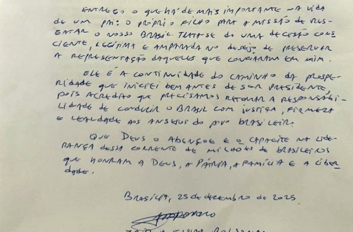 O ex-presidente Jair Bolsonaro (PL-RJ) confirmou, em carta escrita à mão e divulgada por seus filhos nesta quinta-feira (25/12), a pré-candidatura do senador Flávio Bolsonaro à Presidência da República.