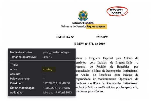 As emendas da Contag foram apresentadas junto à tramitação da Medida Provisória 871/2019. Os textos têm as assinaturas de deputados e senadores. No entanto, a coluna analisou os metadados desses documentos e descobriu que a entidade aparece como a verdadeira autora das propostas. De um total de 578 emendas, 96 têm o nome da Contag ou de advogada da confederação como autor.