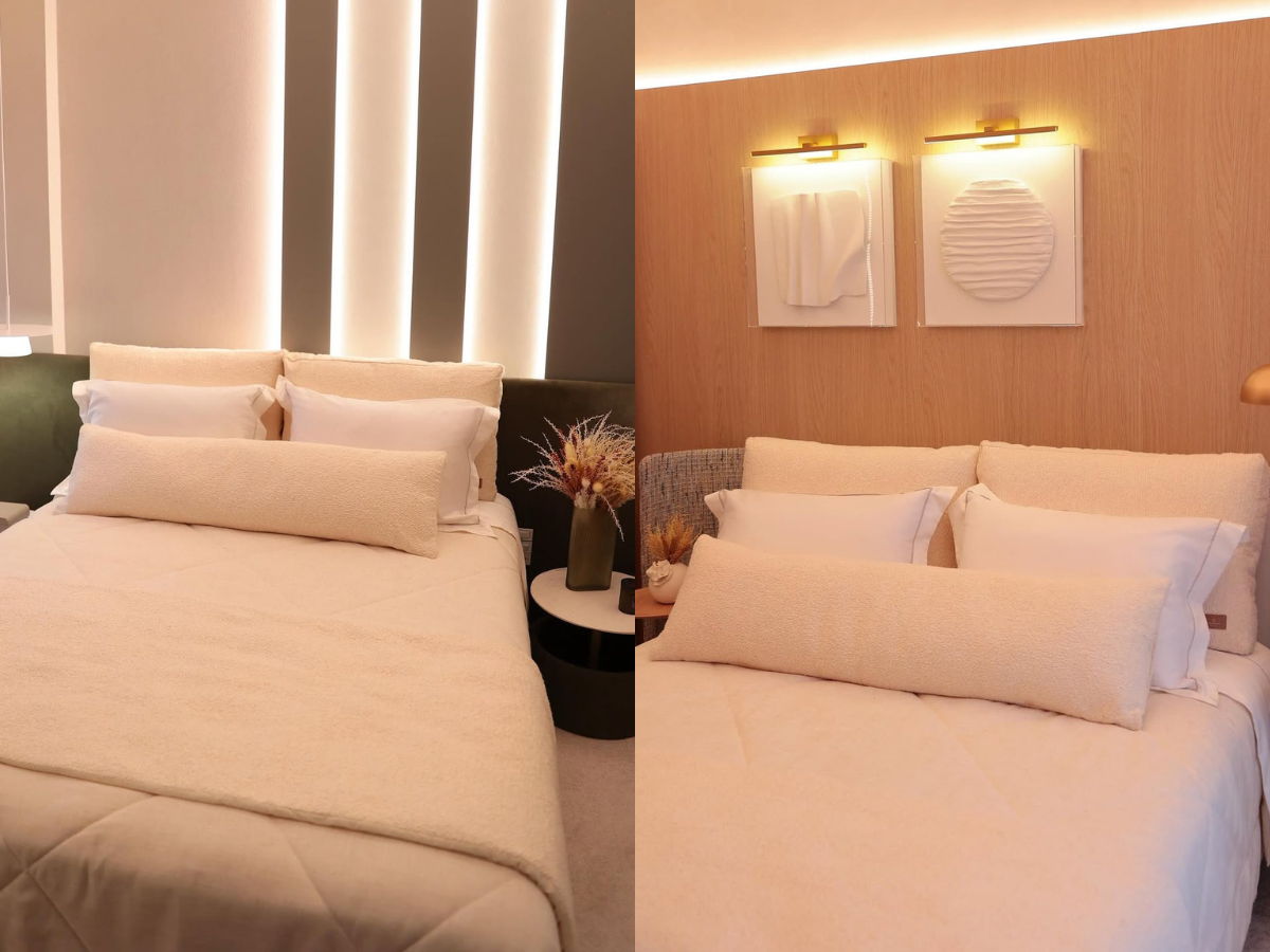 O quarto dela e do marido foi arquitetado com tons terrosos e marcenaria misturada com mármore. “UM SONHO. Meu esperado projeto do apto de Itapema ficou pronto. Vou dividir tudo com vcs! Que alegriaaa!!”, legendou ela no Instagram.
