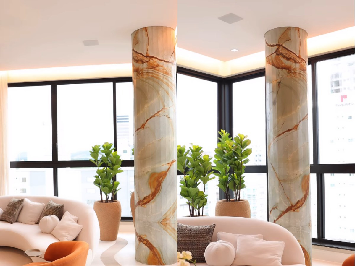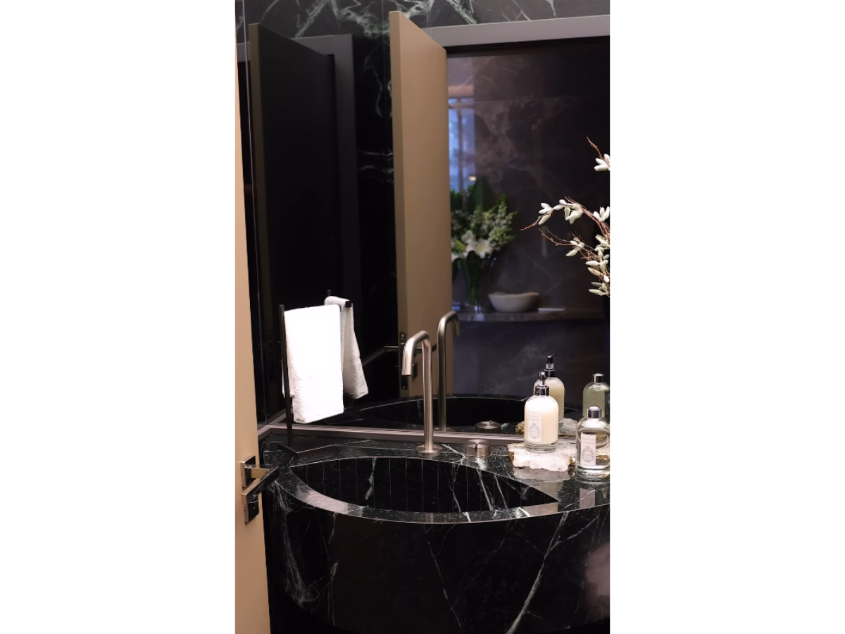 A cozinha contou com a mistura de dois mármores e a coluna da sala apenas com uma. Uma cristaleira iluminada também foi instalada. A mulher de Roberto Justus também exibiu os detalhes da churrasqueira e do lavabo.