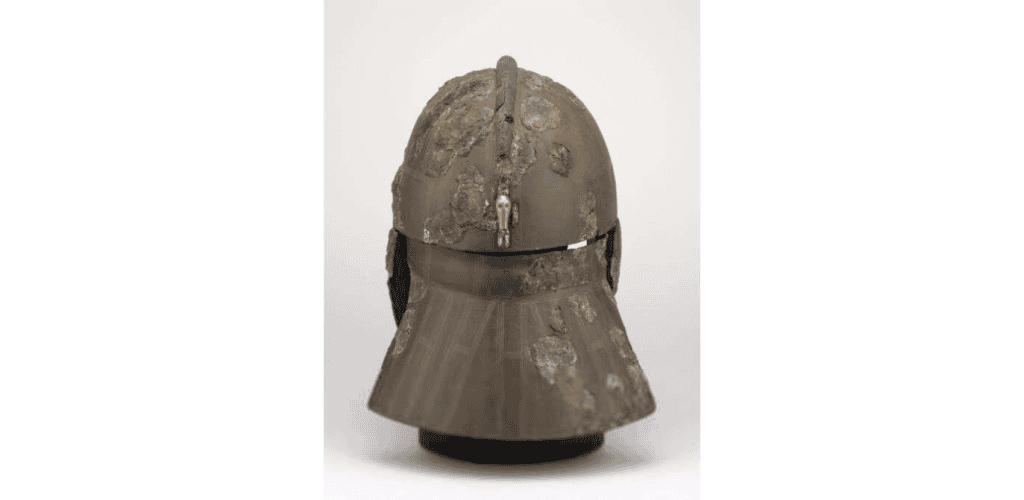 O capacete é feito principalmente de liga de ferro e cobre, com detalhes em prata, ouro e estanho. Como foi localizado em fragmentos, ele precisou ser restaurado. O resultado final deste trabalho é um incrível objeto de 31,8 centímetros de altura e que originalmente pesava cerca de 2,5 kg.