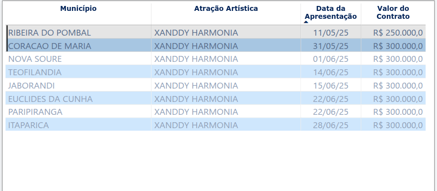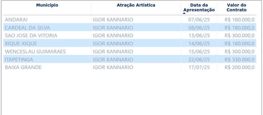 - O cantor Igor Kannário empata com Léo Santana em número de shows, no entanto, o cachê do “príncipe do gueto” é menor. O artista se apresenta em Andaraí, Cardeal da Silva, São José da Vitória, Xique-Xique, Wensceslau Guimarães, Itapetinga e Baixa Grande. O valor do contrato varia entre R$ 180 mil a R$ 330 mil, e o total do artista é de R$ 1.670.000,00.