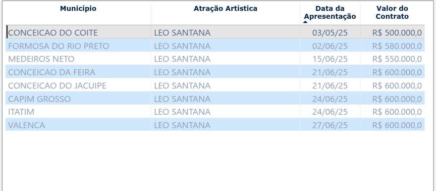 - O ranking é dominado por Léo Santana, que até o momento, tem 7 apresentações no estado, com cachê que varia de R$ 500 mil a R$ 600 mil. Ao todo, o artista irá receber R$ 4.830.000,00 pelas apresentações. Um dos shows citados é o feito na Micareta de Coité e foi retirado da conta para o São João.