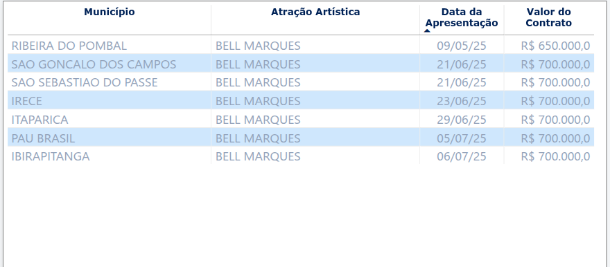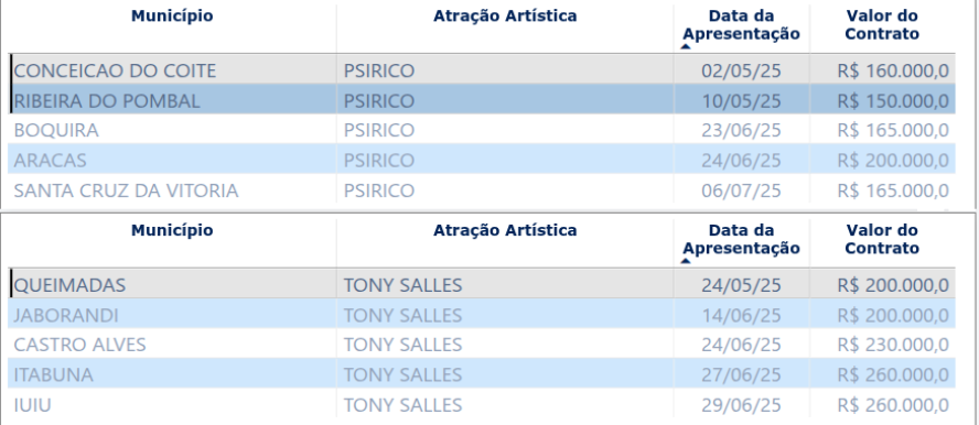 - A banda Psirico tem três apresentações entre junho e junho. O grupo de Márcio Victor irá receber cachês de R$ 165 mil e R$ 200 mil. Pelos três shows, a banda de pagode receberá R$ 530.000,00 mil. Em carreira solo, Tony Salles aparece com quatro shows para junho. O cachê recebido pelo pagodeiro varia entre R$ 200 mil a R$ 260 mil. Tony irá se apresentar em Jaborandi, Castro Alves, Itabuna e Iuiu, e receberá no total R$ 950.000,00.