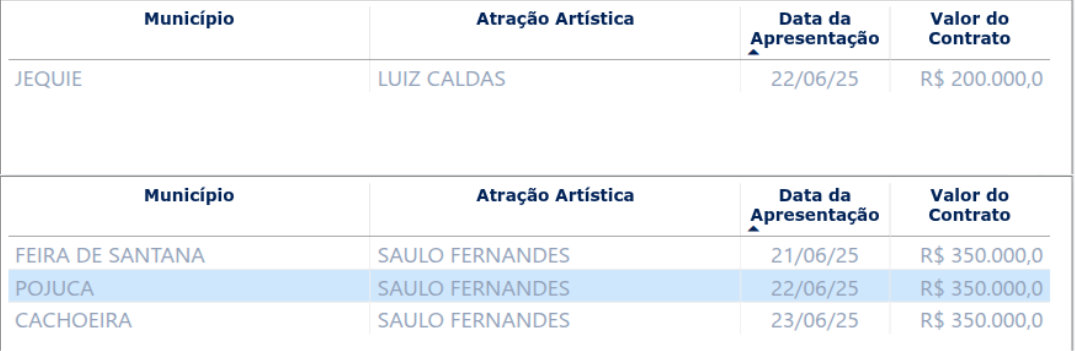 - Já no guarda-chuva do axé, Luiz Caldas tem uma apresentação agendada para Jequié com contrato no valor de R$ 200 mil. Saulo Fernandes irá faturar R$ 1.050.000,00 no São João de 2025. O artista, que tem contrato a R$ 350 mil, agendou apresentações em Feira de Santana, Pojuca e Cachoeira.
