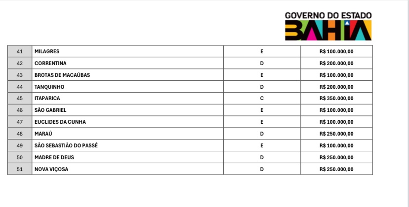 Os 51 municípios habilitados e os valores destinados a cada um podem ser conferidos na publicação oficial no Diário Oficial do Estado da Bahia.