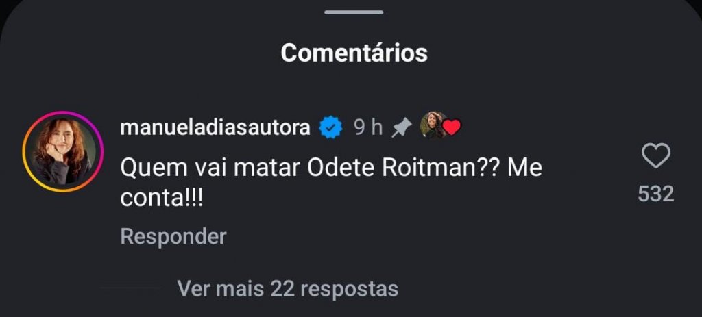 Embarcando na brincadeira, a autora da novela Manuela Dias, comentou na publicação da ativista. “Quem vai matar Odete Roitman?? Me conta!!”, escreveu. No X, antigo Twitter, a política ainda destacou: “Gente, eu não sei onde está a Raquel”.