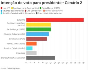 No principal cenário analisado, Lula tem 30% das intenções de voto, seguido por Tarcísio (13%), Gusttavo Lima (12%) e o empresário Pablo Marçal (PRTB), com 11%. Ciro Gomes (PDT) aparece com 9%, enquanto Romeu Zema (Novo) e Ronaldo Caiado (União) registram 3% cada. Indecisos somam 5%, e votos brancos, nulos ou eleitores que não pretendem votar chegam a 14%.