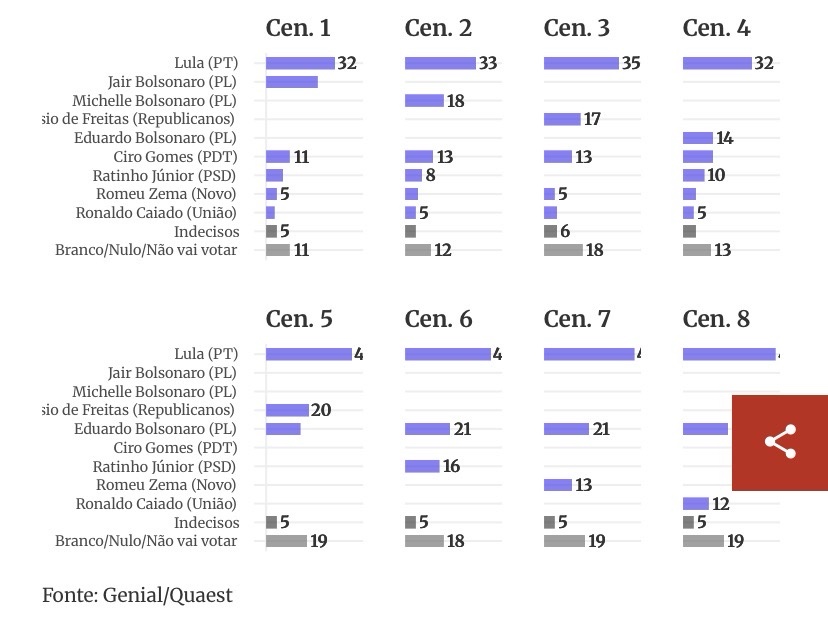Se o cenário 1 é o que Lula, ainda que lidere, obtém o menor percentual de votos (32%), no cenário 8, o presidente apresenta a maior preferência do eleitorado, conquistando 43% do total. Nesse caso, o segundo colocado é Eduardo Bolsonaro (21%), e Caiado o terceiro, com 12%. Os indecisos resultam em 5%, enquanto votos em branco, nulo e os que não vão votar somam 19%.