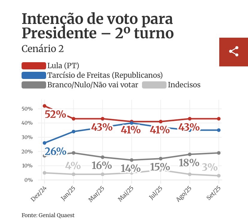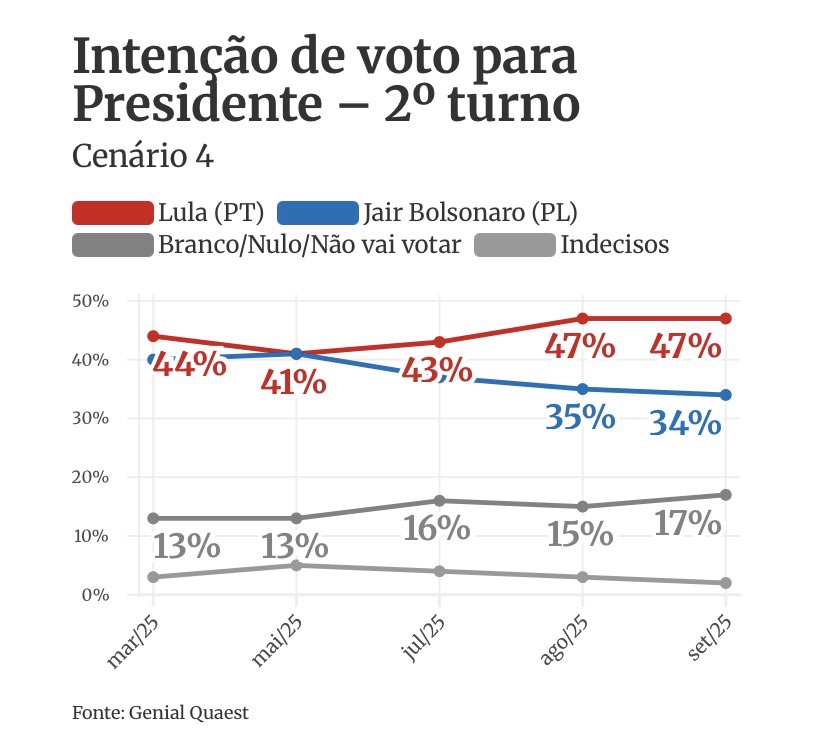 O resultado atual representa a maior diferença entre os dois, com vantagem para o petista, no comparativo histórico: 13 pontos percentuais. A pesquisa é realizada desde março de 2025.
