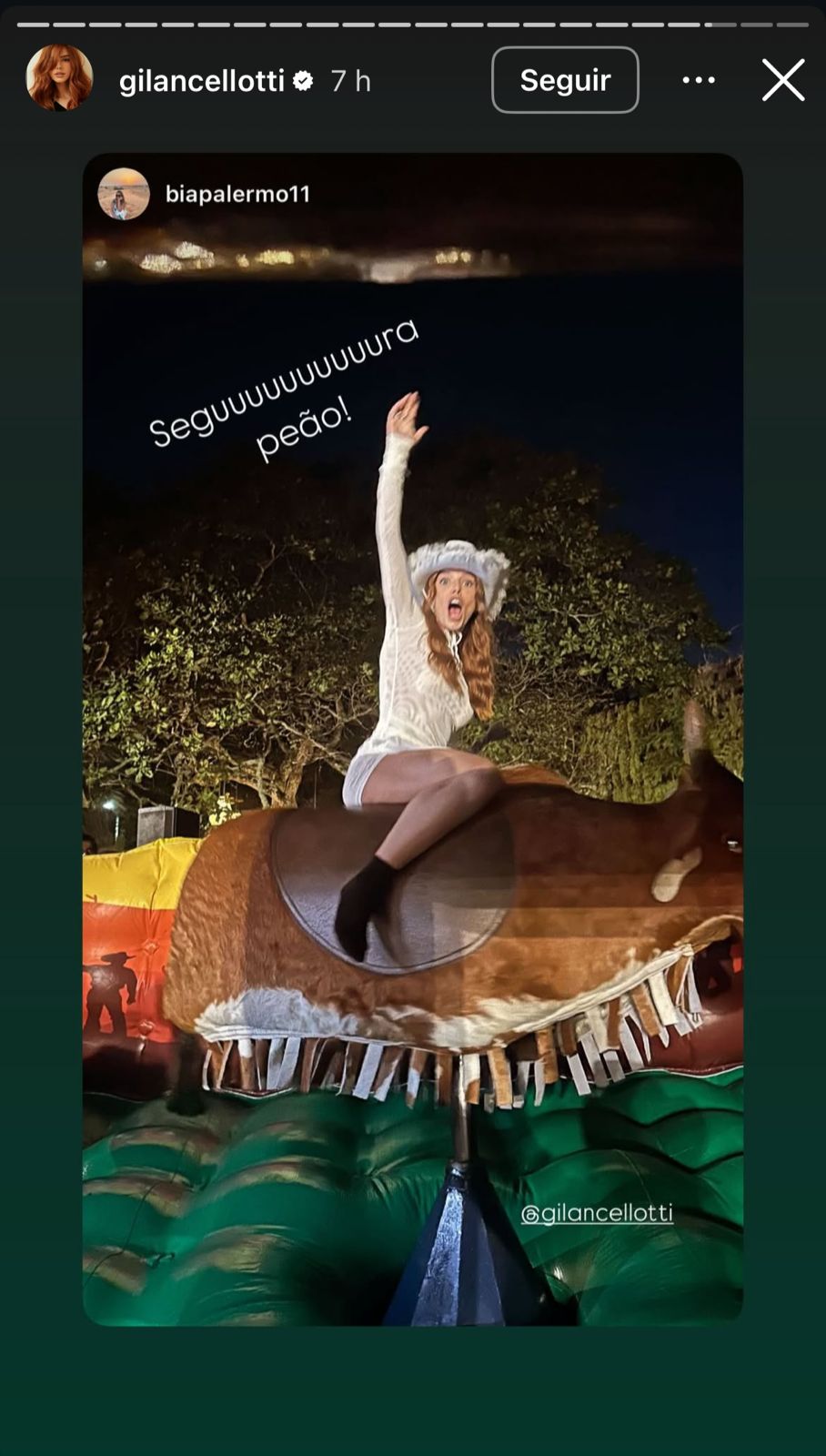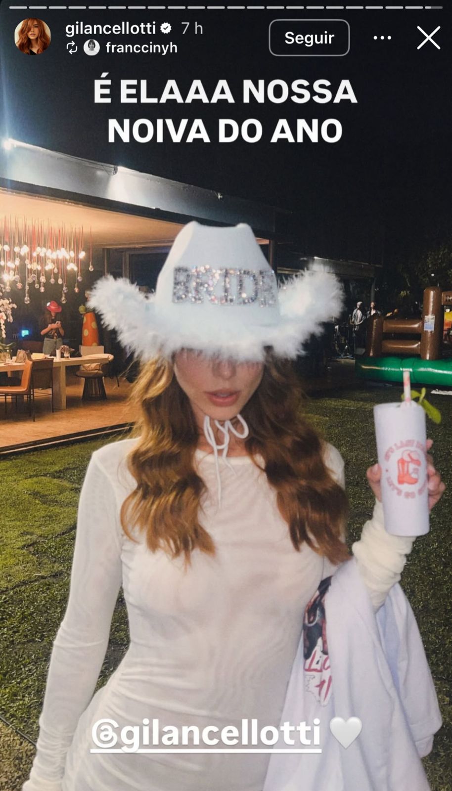 Usando um chapéu de boiadeira personalizado para a ocasião e um vestido branco, Lancellotti foi recebida pelas madrinhas em clima de festa e muita diversão. A programação da festa incluiu competição de shots, máscaras com fotos do noivo e até um touro mecânico, garantindo a animação de convidadas famosas como Fernanda Paes Leme e Cintia Dicker.