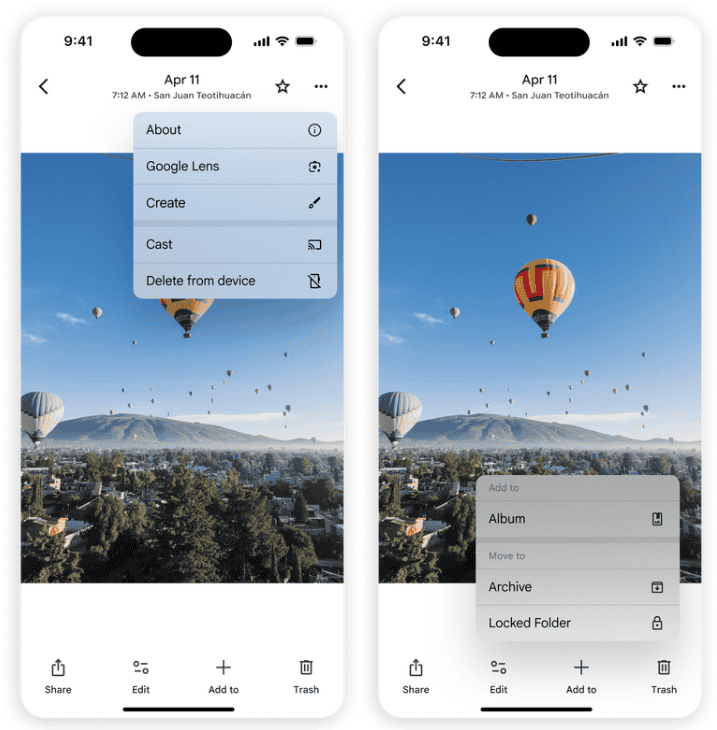 - O botão do Google Lens, antes fixo na barra inferior, agora dá lugar ao menu “Adicionar a”, com atalhos para arquivar imagens, organizá-las em álbuns ou movê-las para pastas protegidas.