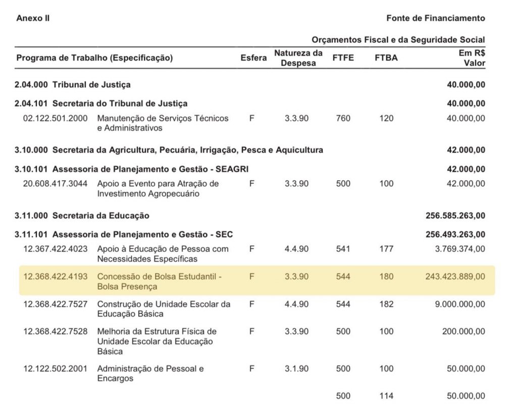 Segundo o texto do próprio decreto, o Artigo 2º da norma afirma que os recursos para cobrir os gastos do Anexo I (Suplementar) virão das fontes indicadas no Anexo II (fonte de financiamento). Vale ressaltar que o Diário Oficial em questão não traz nenhuma referência ou planejamento para uma futura suplementação que compense o corte no Bolsa Presença. Isso não significa que não possa acontecer em outro momento, por meio de um novo decreto financeiro. A mudança de rubricas orçamentárias é um movimento relativamente comum para adequações de investimentos e gastos ao longo do ano.