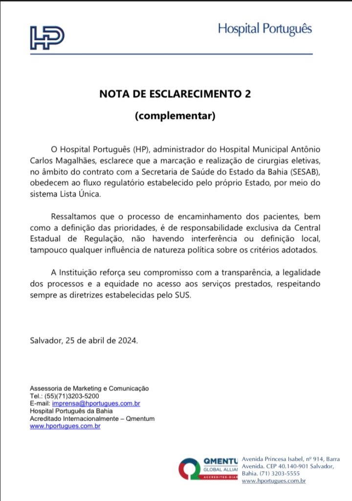 O Hospital Português (HP) encaminhou a redação do Euclides Diário uma Nota de Esclarecimento complementar nesta segunda-feira (28), reforçando que a marcação e a realização de cirurgias eletivas no Hospital Municipal Antônio Carlos Magalhães seguem rigorosamente o fluxo regulatório da Secretaria de Saúde do Estado da Bahia (SESAB), sem qualquer tipo de interferência política.
