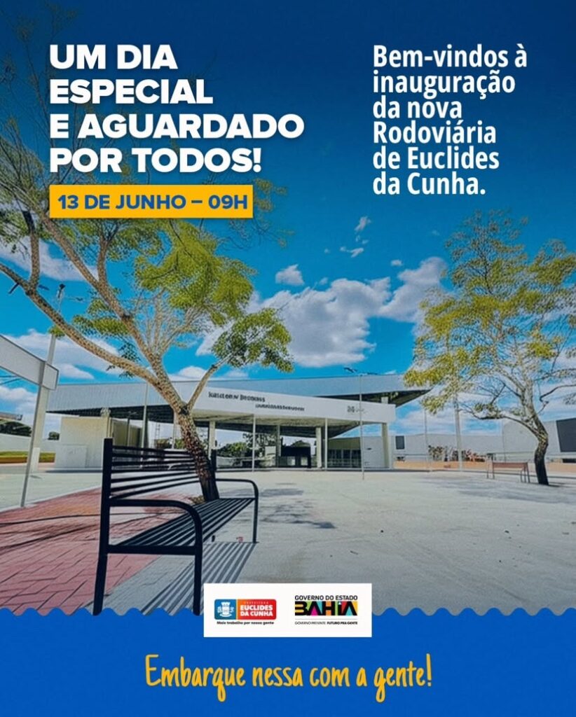 A nova rodoviária de Euclides da Cunha será finalmente inaugurada. Após mais de um ano de concluída, a estrutura será oficialmente entregue à população no próximo dia 13 de junho, conforme anunciado pelo prefeito Helder Macedo em vídeo divulgado nas redes sociais.