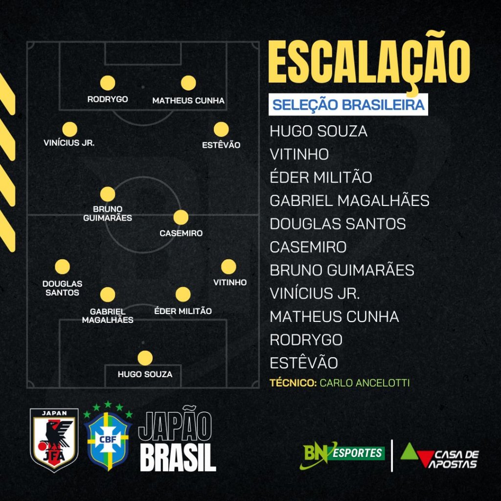 Diante deste cenário, a provável escalação da equipe verde e amarela deverá ser composta por Hugo Souza; Douglas Santos, Gabriel Magalhães, Éder Militão e Vitinho; Casemiro e Bruno Guimarães; Vinícius Júnior, Matheus Cunha, Rodrygo e Estêvão.