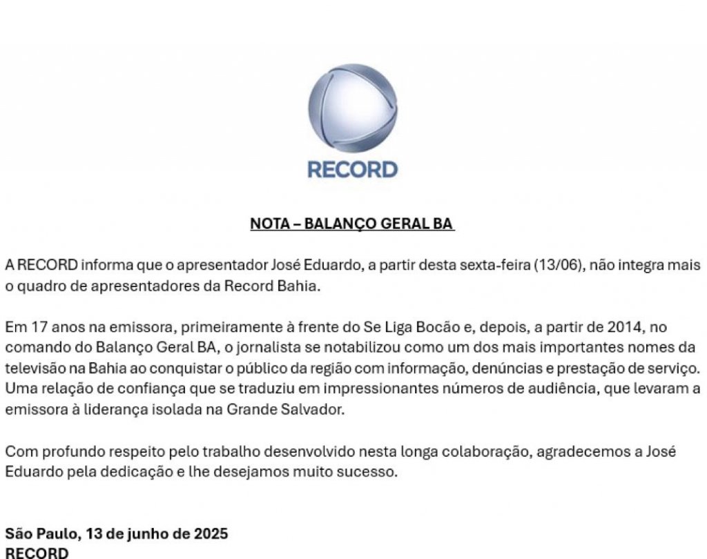 A informação foi confirmada em nota pela Record. Segundo a emissora, “com profundo respeito pelo trabalho desenvolvido nesta longa colaboração, agradecemos a José Eduardo pela dedicação”.