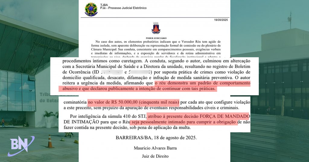 O Executivo municipal acionou a justiça após o parlamentar realizar filmagens não autorizadas e agir de forma intimidatória contra servidores em unidades de saúde. A decisão, confirmada pela Segunda Câmara Cível do TJ-BA, atende a um pedido da gestão de Barreiras.