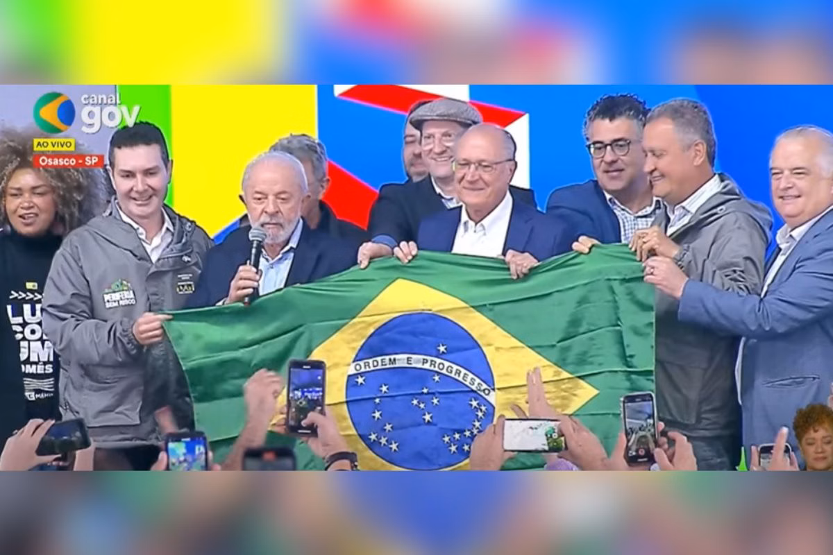 O petista posou com a bandeira do Brasil no palco do evento, ao lado do vice-presidente da República, Geraldo Alckmin (PSB), e de ministros. Lula disse que os bolsonaristas se apropriaram de símbolos nacionais e que, agora, estão subservientes aos americanos.