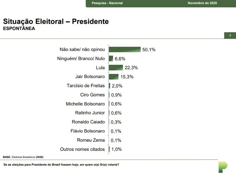 No cenário espontâneo, quando o entrevistado responde sem ver os nomes dos candidatos, Lula aparece com 22% das intenções de voto, seguido do ex-presidente Jair Bolsonaro (PL), que soma 15,3%. O governador de São Paulo, Tarcísio de Freitas (Republicanos), vem em terceiro lugar, com 3%. Mais da metade dos entrevistados, 52%, não soube responder, e 6% disseram que votariam em branco ou nulo.