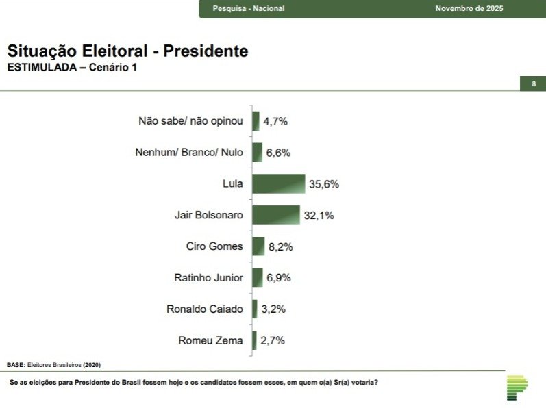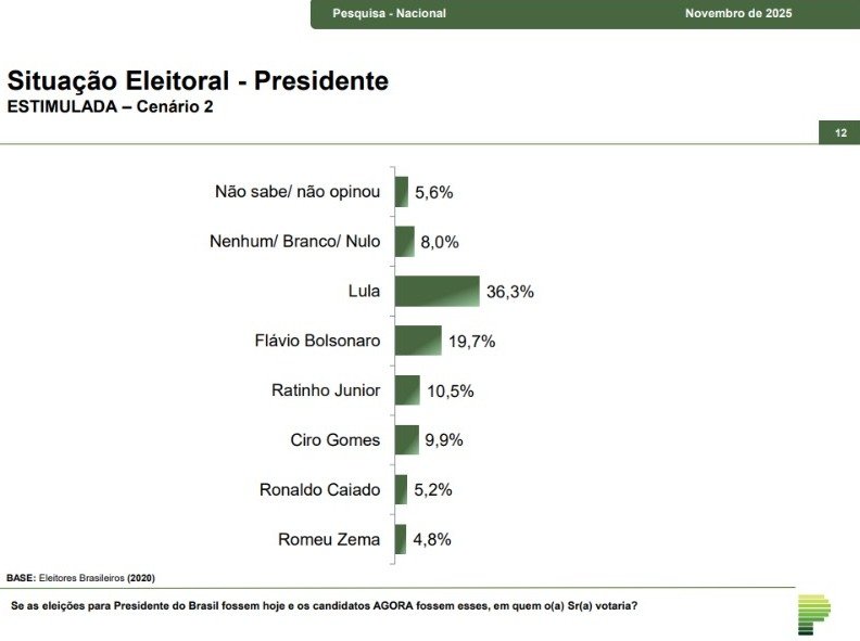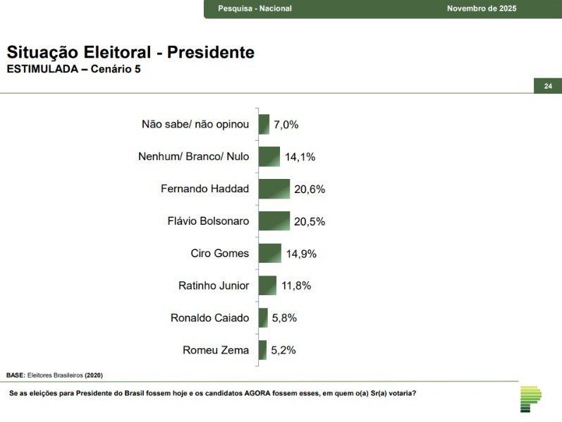 No único cenário testado sem a presença de Lula, o ministro da Fazenda, Fernando Haddad (PT), lidera com 20,6%, mas aparece tecnicamente empatado com Flávio Bolsonaro, que tem 20,5%. Em seguida, surgem Ciro Gomes, com 14,9%, e Ratinho Jr., com 14% das intenções de voto.