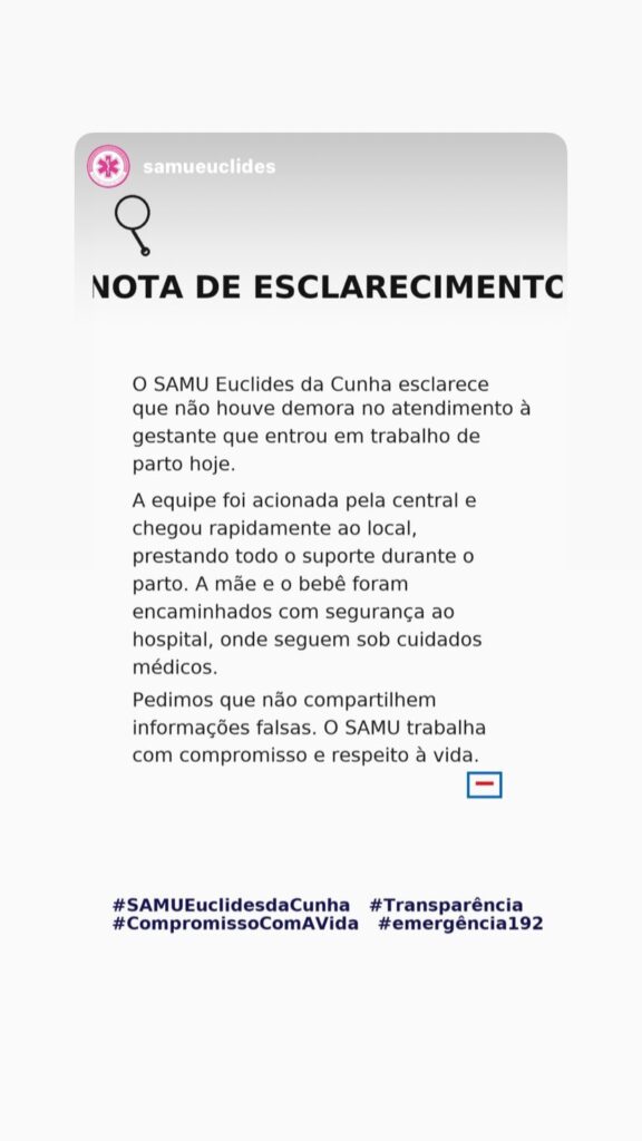 Nos áudios, o interlocutor — cuja identidade não foi confirmada — narra a tensão do momento e critica a demora no atendimento. Ele afirma que a SAMU só chegou após o nascimento da criança, o que colocou em risco a vida da mãe e do bebê.