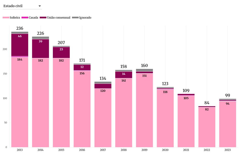 Nos dados do DataSUS, em 88% dos casos as meninas se declararam solteiras. Em 0,35% elas estavam casadas e em 9,20% em união consensual. Veja: