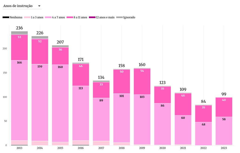 Os dados são da década de 2013 a 2023, disponíveis na plataforma do Ministério da Saúde. Apesar do dado alarmante, há uma diminuição, ao longo dos anos, de mães com até 14 anos. Em 2013, foram 236. Já em 2023, o número estava em 99 casos. Informações preliminares levantados pela Fundação Abrinq apontam para 80 casos em 2024.