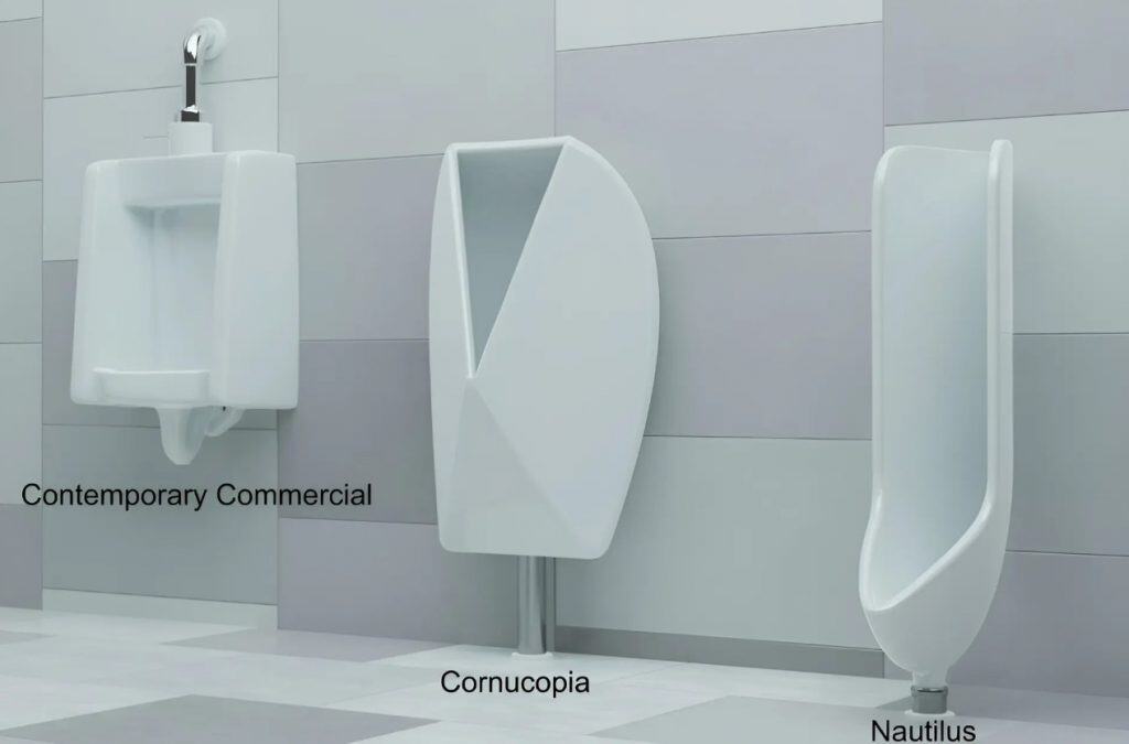 - Segundo eles, o formato atual da maioria dos mictórios forma um ângulo de 60 a 90 graus em relação ao jato de urina do usuário.