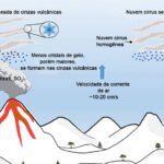 Quando um vulcão entra em erupção, ele libera diversos gases e partículas. Entre eles estão o dióxido de carbono, o dióxido de enxofre e uma grande quantidade de cinzas. Essas cinzas sobem até a camada mais alta da atmosfera e se misturam ao ar. Lá, elas funcionam como pequenas “sementes” para a formação de cristais de gelo.
