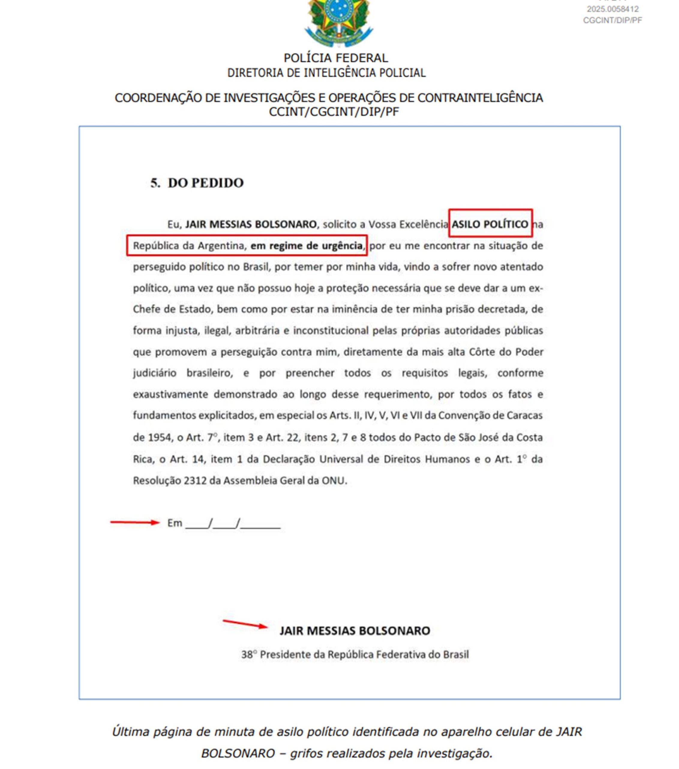 Segundo a PF, a suspeita surgiu a partir de um documento encontrado no celular de Bolsonaro. O material seria um rascunho de carta endereçada ao presidente da Argentina, Javier Milei, em que o ex-chefe do Executivo solicitava asilo político.