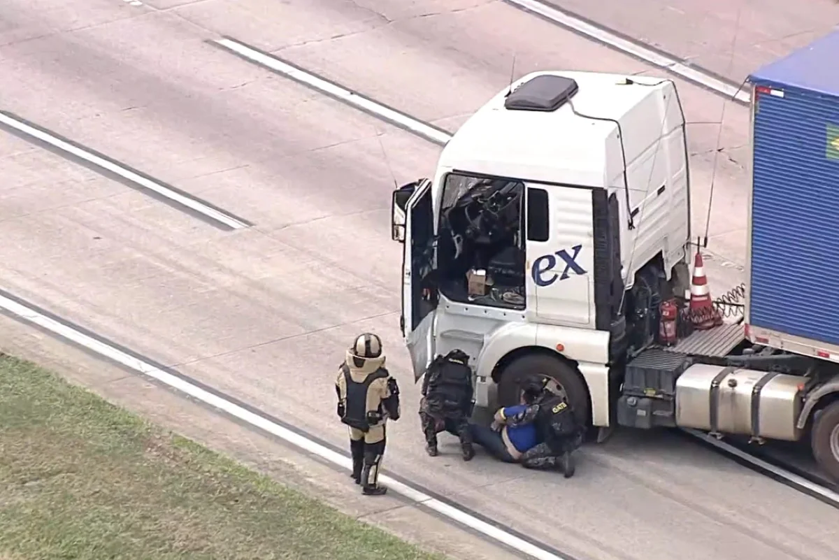 O motorista do caminhão que foi sequestrado no Rodoanel, na manhã desta quarta-feira (12/11), desmaiou e caiu da cabine do veículo ao ser resgatado por um agente do Grupo de Ações Táticas Especiais (Gate) da Polícia Militar. Ele passou horas amarrado a um artefato suspeito de ser explosivo — mais tarde, a Polícia Militar confirmou que se tratava de um simulacro de bomba.