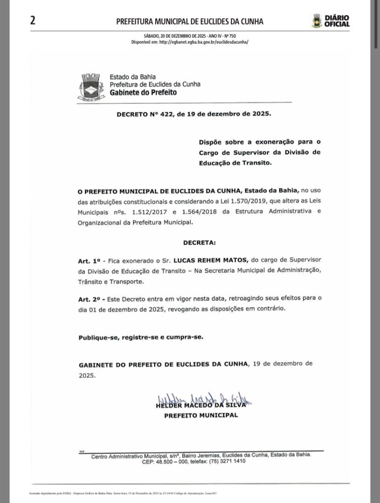 O Ministério Público do Estado da Bahia (MP-BA) intensificou a fiscalização sobre a Prefeitura de Euclides da Cunha e passou a cobrar providências imediatas da gestão do prefeito Helder Macedo, conhecido como Heldinho (PDT). As apurações envolvem suspeitas de servidores fantasmas e possíveis irregularidades nos gastos com a decoração natalina do município.
