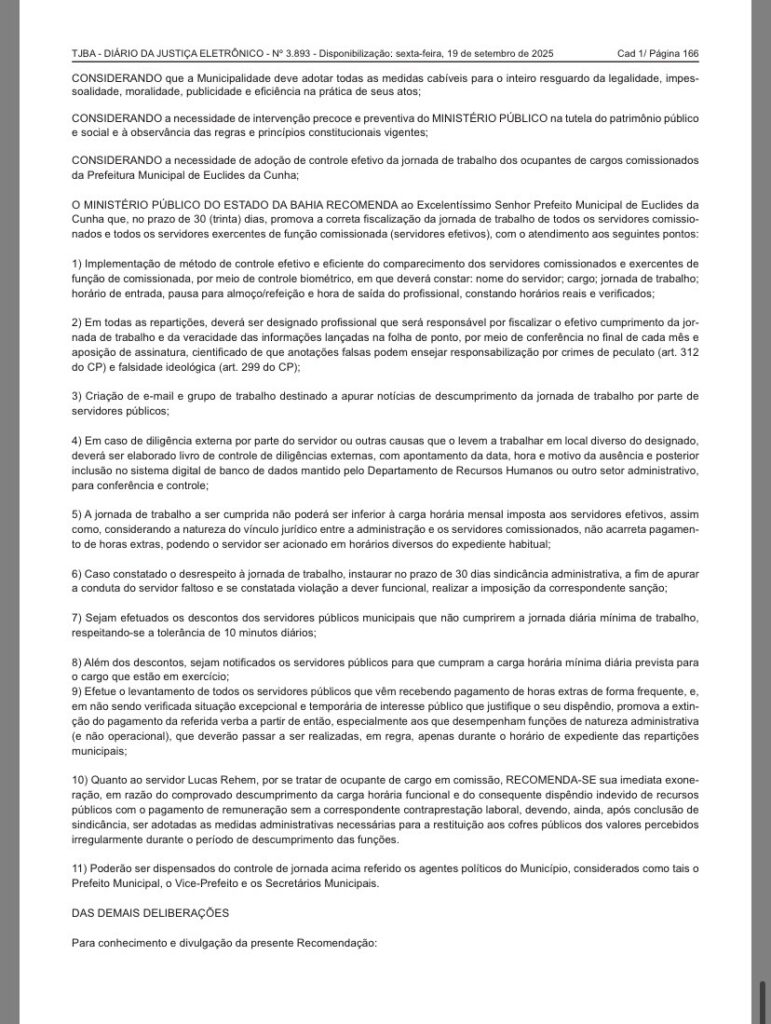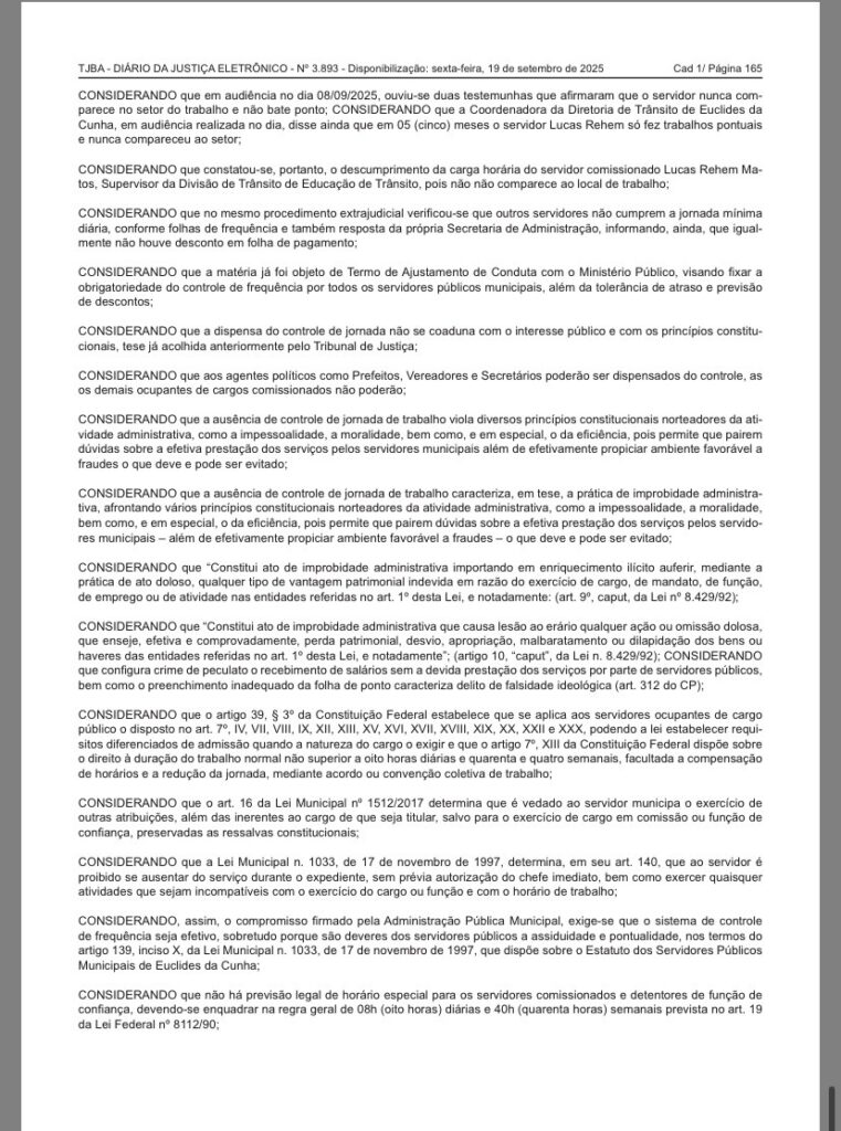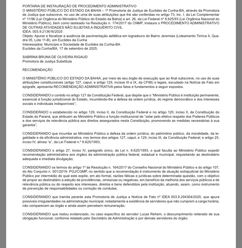O Ministério Público do Estado da Bahia (MP-BA), por meio da 1ª Promotoria de Justiça de Euclides da Cunha, instaurou um procedimento administrativo para apurar irregularidades no cumprimento da carga horária de servidores públicos municipais, especialmente no caso do servidor Lucas Rehem Matos, supervisor da Divisão de Trânsito e Educação de Trânsito, acusado de reiterada ausência no setor de trabalho.