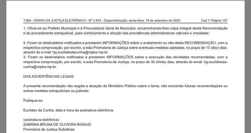 A recomendação administrativa, publicada no Diário da Justiça Eletrônico em 19 de setembro de 2025, foi assinada pela promotora de Justiça substituta Sabrina Bruna de Oliveira Rigaud. O documento destaca que, em audiência realizada em 8 de setembro, testemunhas confirmaram que o servidor não comparecia ao local de trabalho, informação corroborada por setores administrativos da Prefeitura.