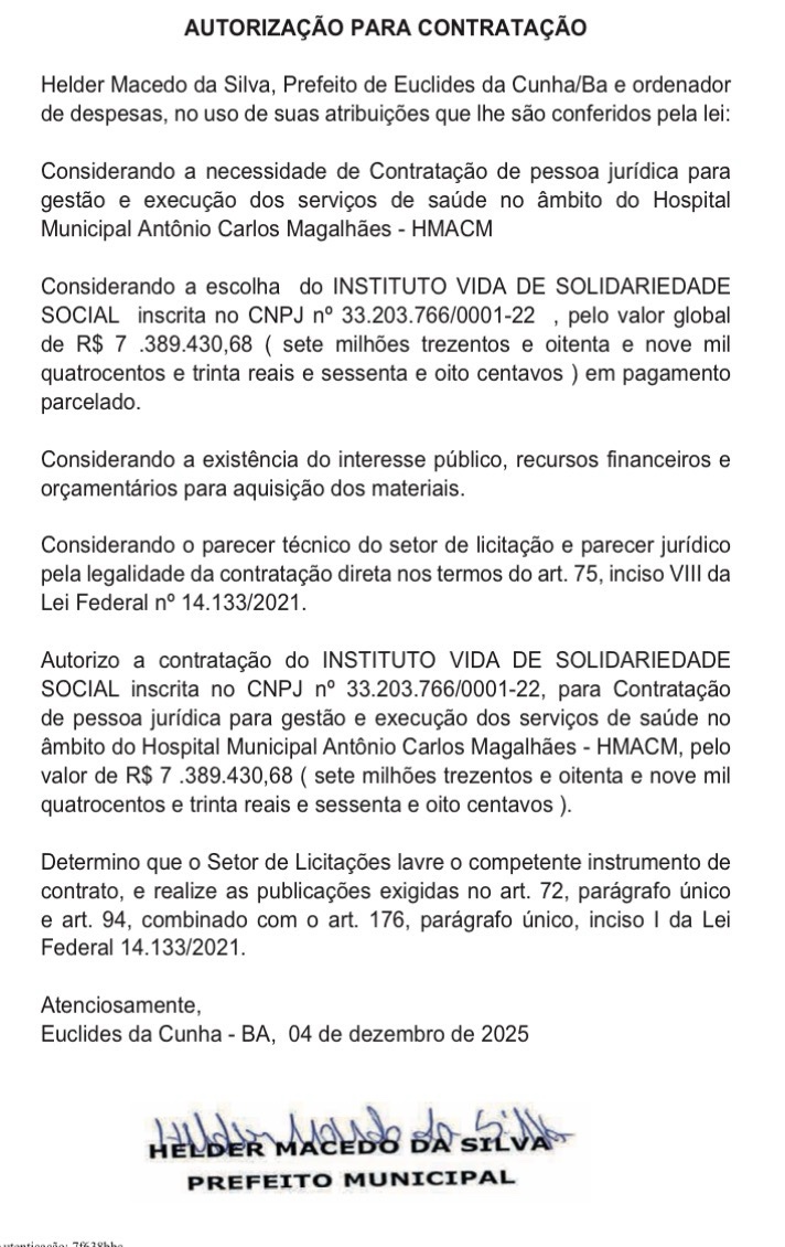A Prefeitura de Euclides da Cunha oficializou, em 04 de dezembro de 2025, a contratação do Instituto Vida de Solidariedade Social para assumir a gestão e execução dos serviços de saúde do Hospital Municipal Antônio Carlos Magalhães (HMACM). A decisão ocorre após chamamento público e encerra um ciclo de quase uma década sob administração do Hospital Português.