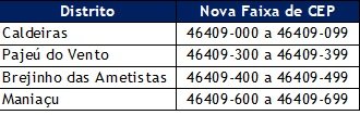 Os Correios concluíram a atualização dos Códigos de Endereçamento Postal (CEPs) nos municípios baianos de Caetité, no Sudoeste; Fátima, no Nordeste do estado; Monte Santo, na região sisaleira; e Souto Soares, na Chapada Diamantina, além de quatro distritos de Caetité.