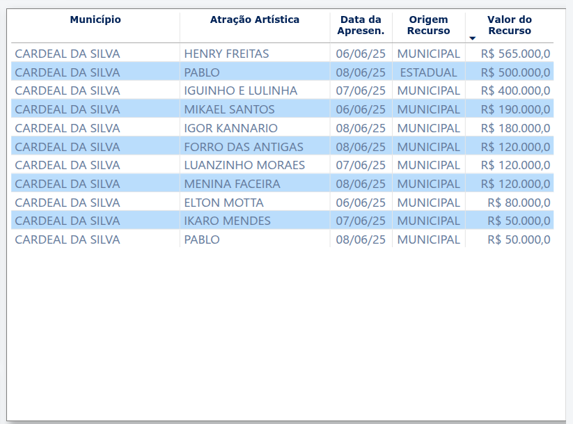 O Bahia Notícias fez a análise dos municípios com menos de 10 mil habitantes. Na lista, a cidade de Cardeal da Silva, que tem 8.365 habitantes, também investiu alto na festa. Só de verba de origem municipal, foram gastos R$ 1.875.000,00 em contratações, sendo as mais caras Henry Freitas (R$ 565 mil) e Iguinho & Lulinha (R$ 400 mil). De verba estadual, a contratação mais cara foi o cantor Pablo, com R$ 500 mil.