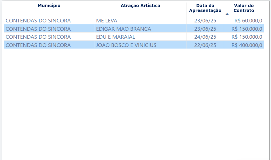 Entre as dez cidades com a menor população da Bahia, as contratações feitas pela cidade de Contendas do Sincorá também salta os olhos. O município, que tem uma população de 4.333 pessoas, investiu R$ 400 mil na contratação da dupla sertaneja João Bosco e Vinícius, para uma apresentação no dia 22 de junho. A origem do recurso, assim como a de Gavião, é municipal.