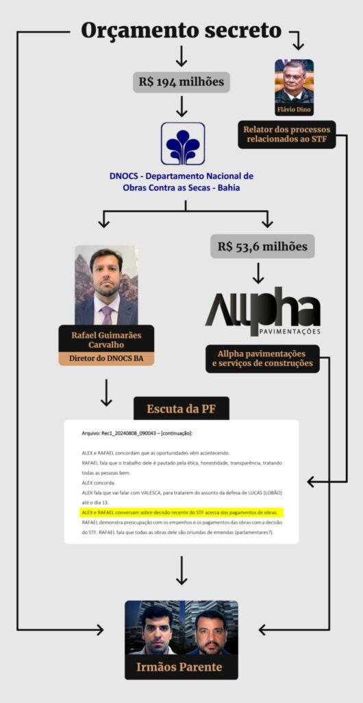 A empresa que mais recebeu valores do DNOCS-BA foi a Allpha Pavimentações, que tem como sócios os irmãos Alex e Fabio Parente. A empresa é investigada na operação Overclean e recebeu ao menos R$ 53 milhões da filial baiana da autarquia federal provenientes de emendas do relator.