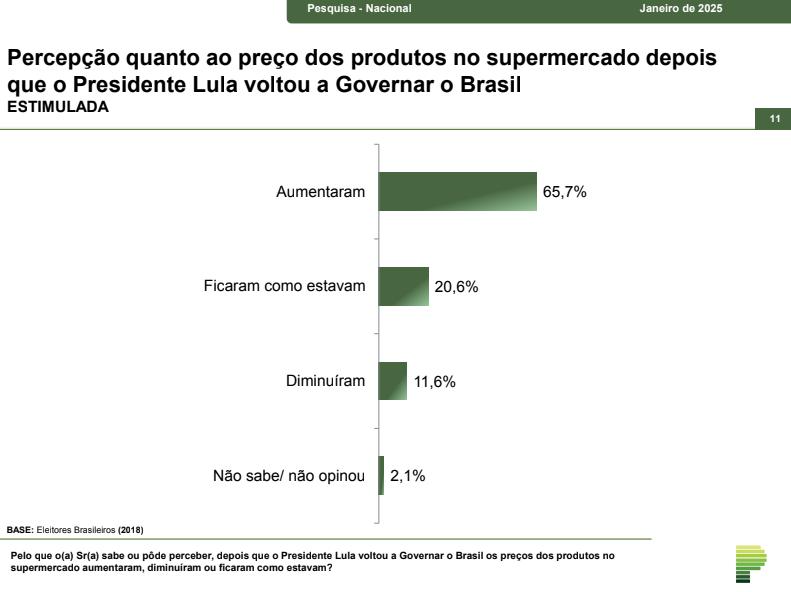 A segunda pergunta feita na entrevista foi relacionada a percepção quanto ao preço dos produtos no supermercado depois que o Presidente Lula voltou a Governar o Brasil. Cerca de 65,7% dos eleitores indicaram um aumento no preço dos produtos.