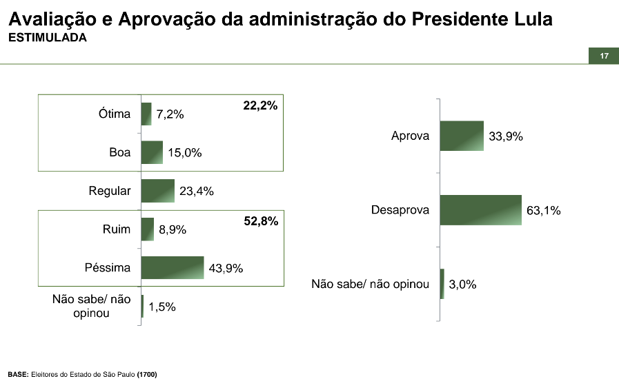A pesquisa também apontou que 63,1% dos paulistas desaprovam a gestão do petista. Sobre a aprovação do presidente, 33,9% dos entrevistados pela pesquisa afirmaram que aprovam a administração, enquanto 3% não souberam responder. No caso da avaliação, 8,9% afirmam que a gestão é ruim e 43,9% disseram ser péssima. 15% avaliaram como boa e 7,2% como ótima. Dentre os entrevistados, 23,4% afirmaram que o governo é regular.