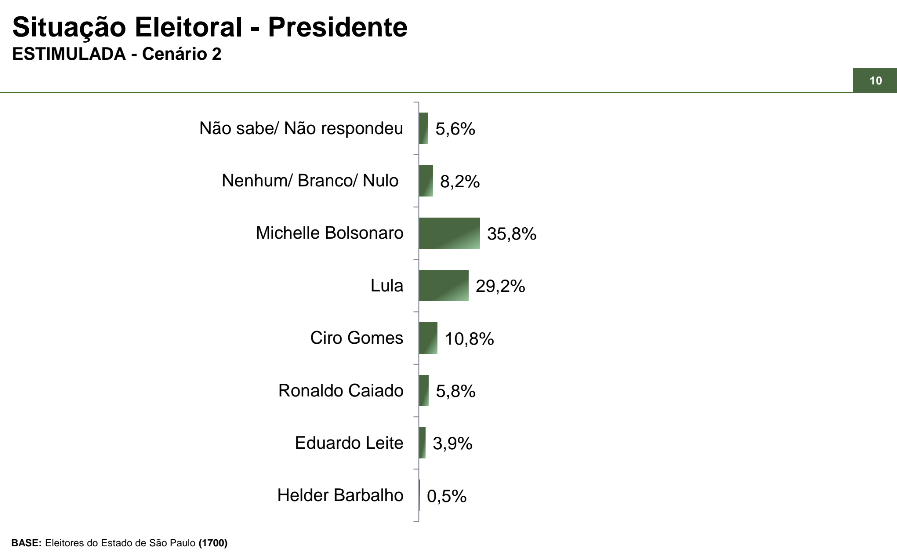 No segundo cenário proposto pela pesquisa, com a pergunta “Se as eleições para Presidente do Brasil fossem hoje e os candidatos AGORA fossem esses, em quem o(a) Sr(a) votaria?”, Michelle Bolsonaro aparece em primeiro lugar com 35,8% das intenções de voto.