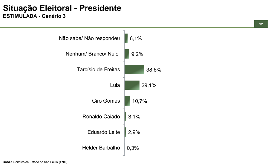 Em um terceiro cenário apresentado, que não tem como opção Jair Bolsonaro nem Michelle, o governador do estado Tarcísio ficou em primeiro lugar com 38,6%. O atual presidente ocupa a segunda posição com 29,1%. Ciro aparece em 3º lugar com 10,7% dos votos, e os três últimos lugares são ocupados por, Ronaldo Caiado (3,1%), Eduardo Leite (2,9%) e Helder Barbalho (0,3%).