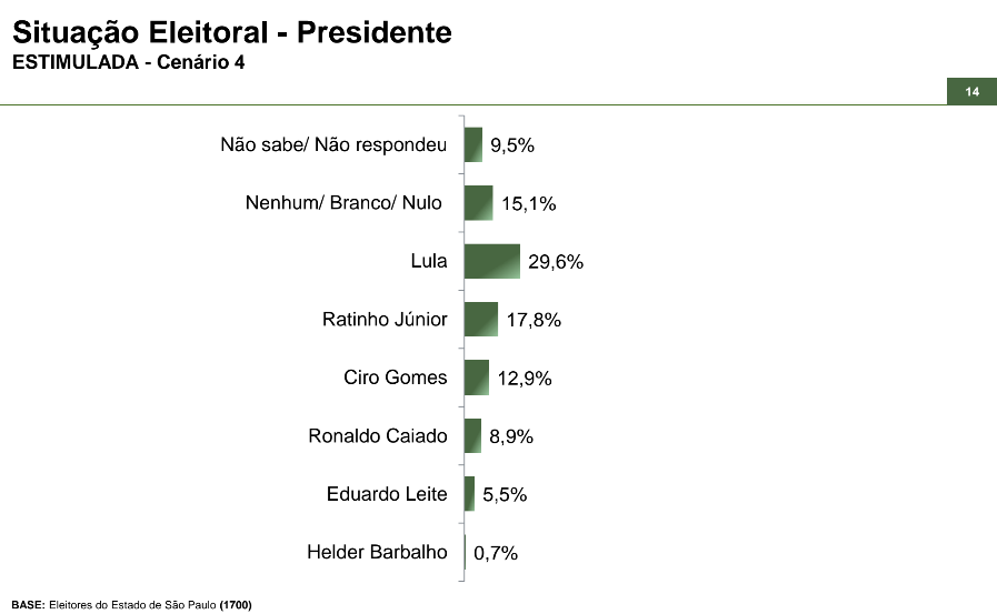 O atual presidente Lula fica em primeiro lugar apenas no último cenário apresentado. Com 29,6% dos votos, o petista supera Ratinho Júnior (17,8%), Ciro Gomes (12,9%), Ronaldo Caiado (8,9%), Eduardo Leite (5,5%) e Helder Barbalho (0,7%).