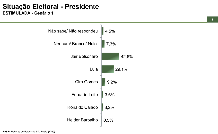 No cenário proposto pela pesquisa, com a pergunta “Se as eleições para Presidente do Brasil fossem hoje e os candidatos fossem esses, em quem o(a) Sr(a) votaria?”, a prioridade de voto dos eleitores se repete com Bolsonaro recebendo 42,6% dos votos dos eleitores.