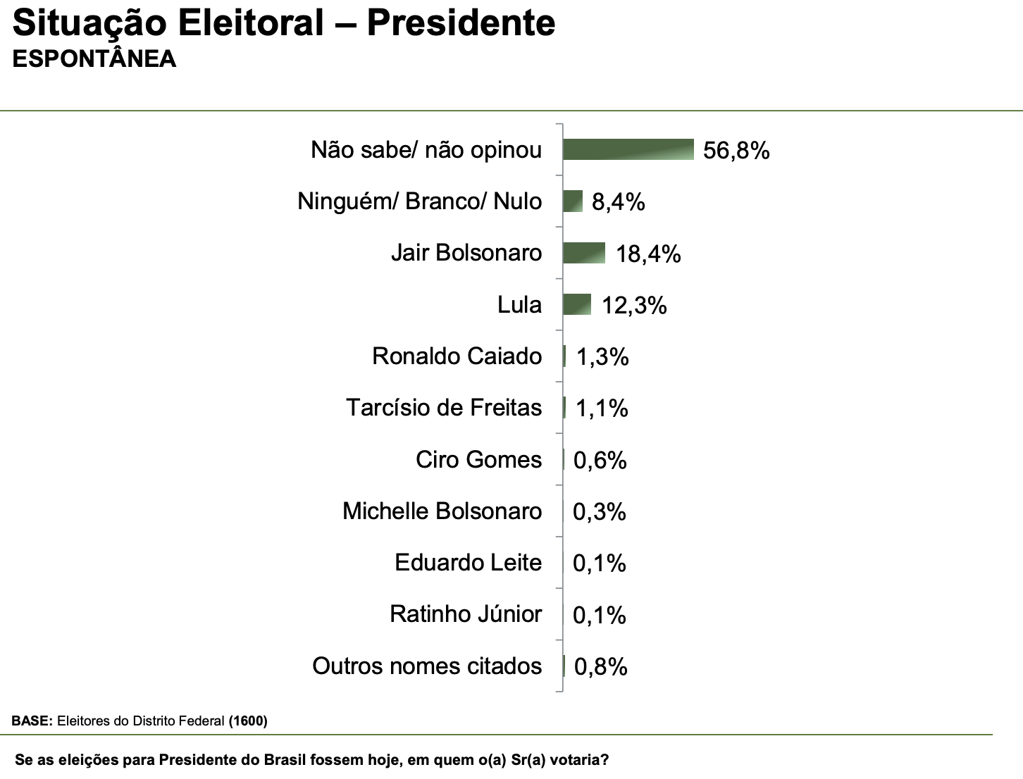 Bolsonaro também lidera as intenções de voto quando no cenário espontâneo, quando o nome dos candidatos não é apresentado aos entrevistados. O ex-presidente soma 18,4% frente aos 12,3% de Lula.