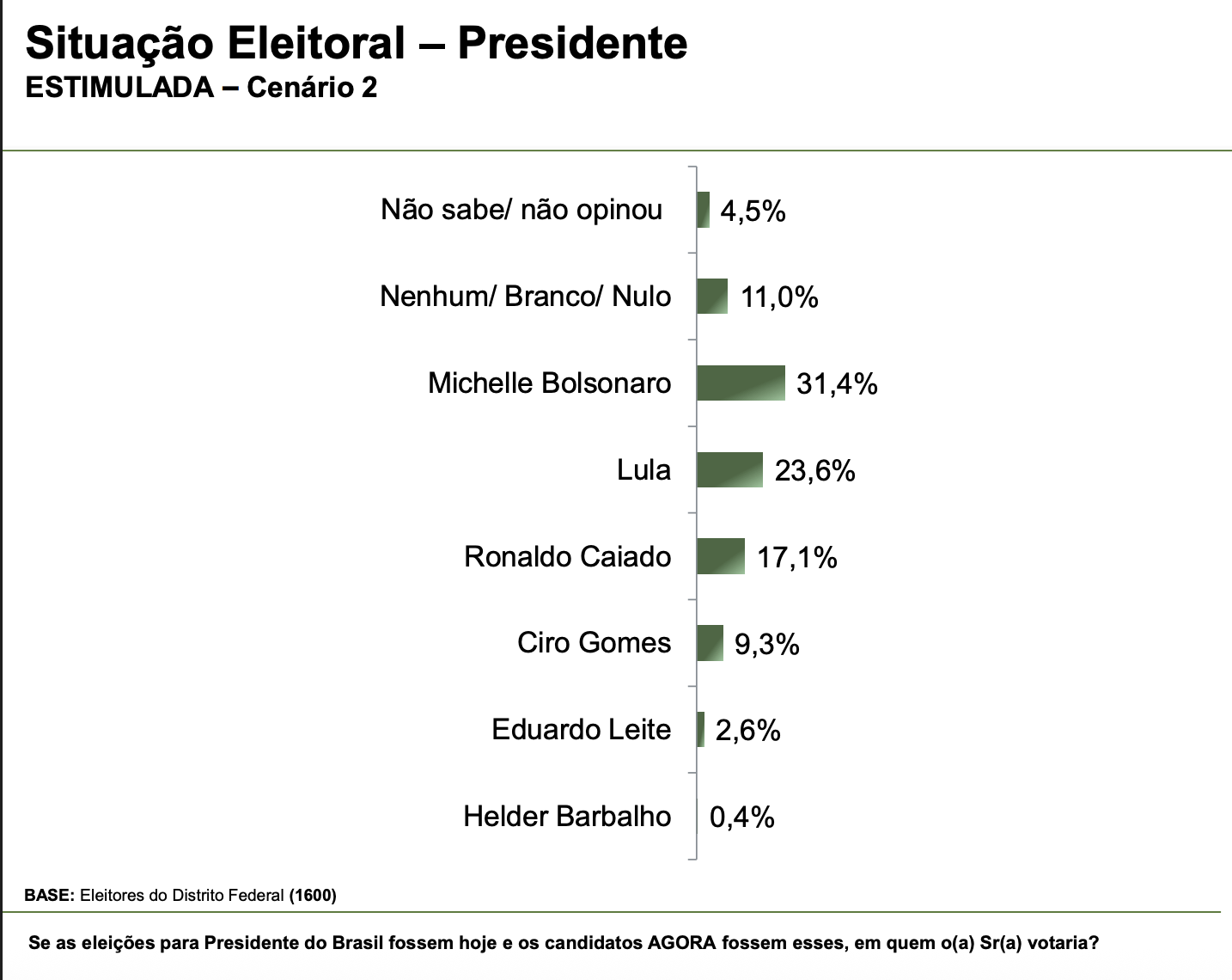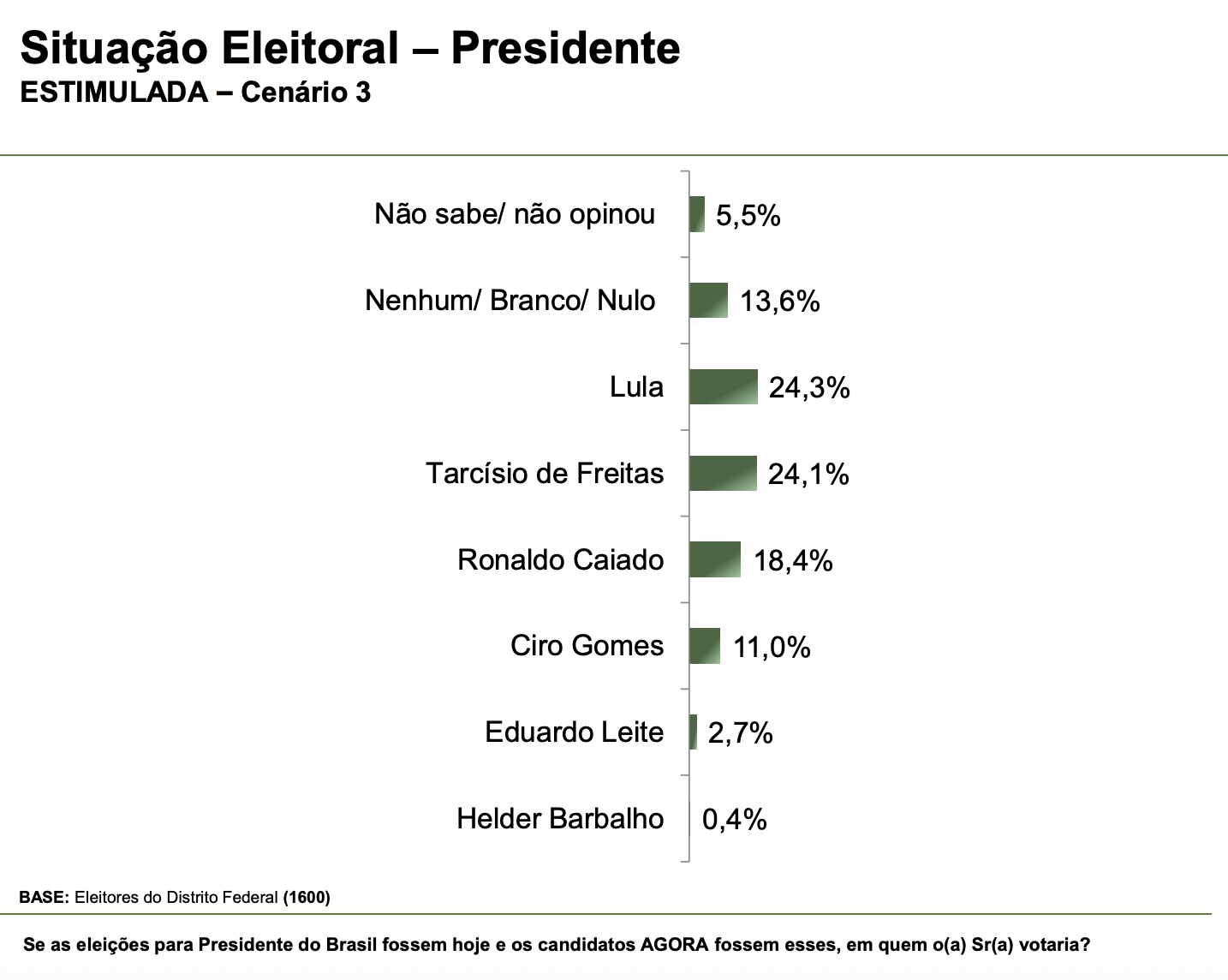 O cenário estimulado também aponta Ronaldo Caiado (União) na terceira posição com 11,2%. Ele é seguido por Ciro Gomes (PDT) (8,6%) e Eduardo Leite (PSDB) (2,2%). Não sabe ou não opinou representa 4,3% do levantamento e brancos e nulos 9,5%.