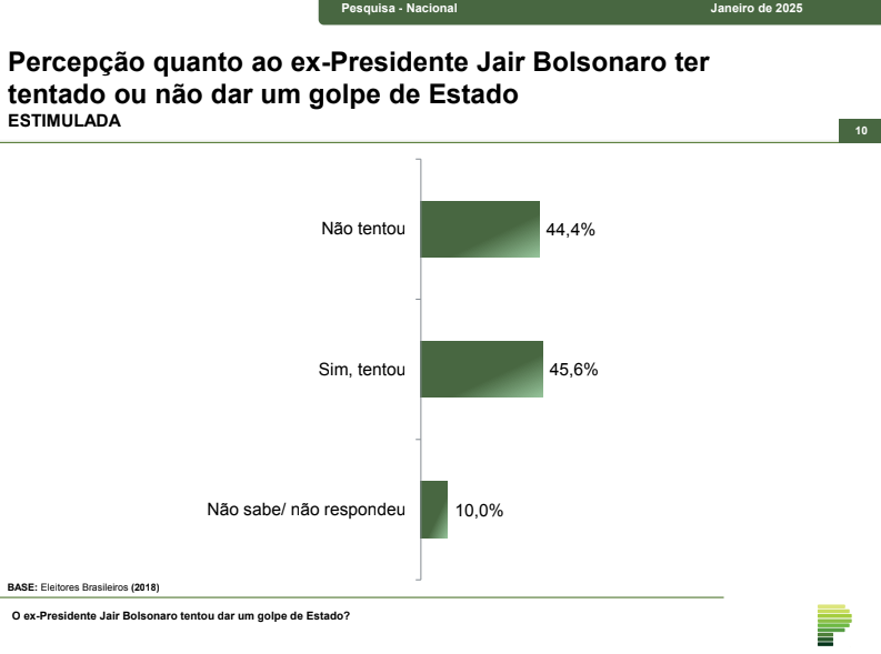 Quando questionados se acreditavam que o ex-presidente teria tentado dar um golpe de Estado, os eleitores se dividiram. A pesquisa indica que 45,6% dos entrevistados acreditam que Jair Bolsonaro tentou, enquanto 44,4% afirmam que não.