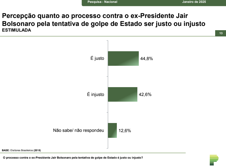 O levantamento feito pelo Paraná Pesquisas ainda indagou os eleitores sobre o processo contra o ex-presidente ser justo ou não. Para 44,8% dos entrevistados, a investigação é justa. Já 42,6% dos eleitores acreditam que a movimentação contra o militar é injusta.
